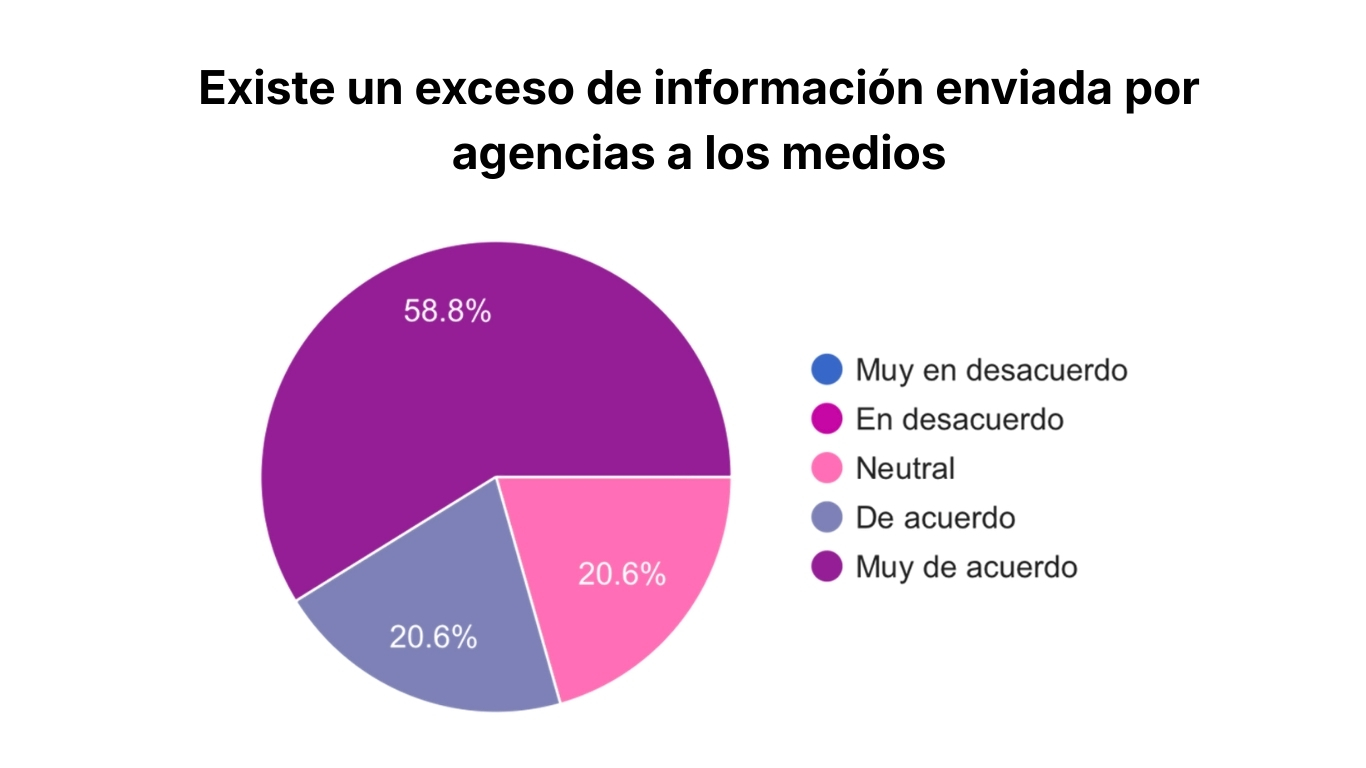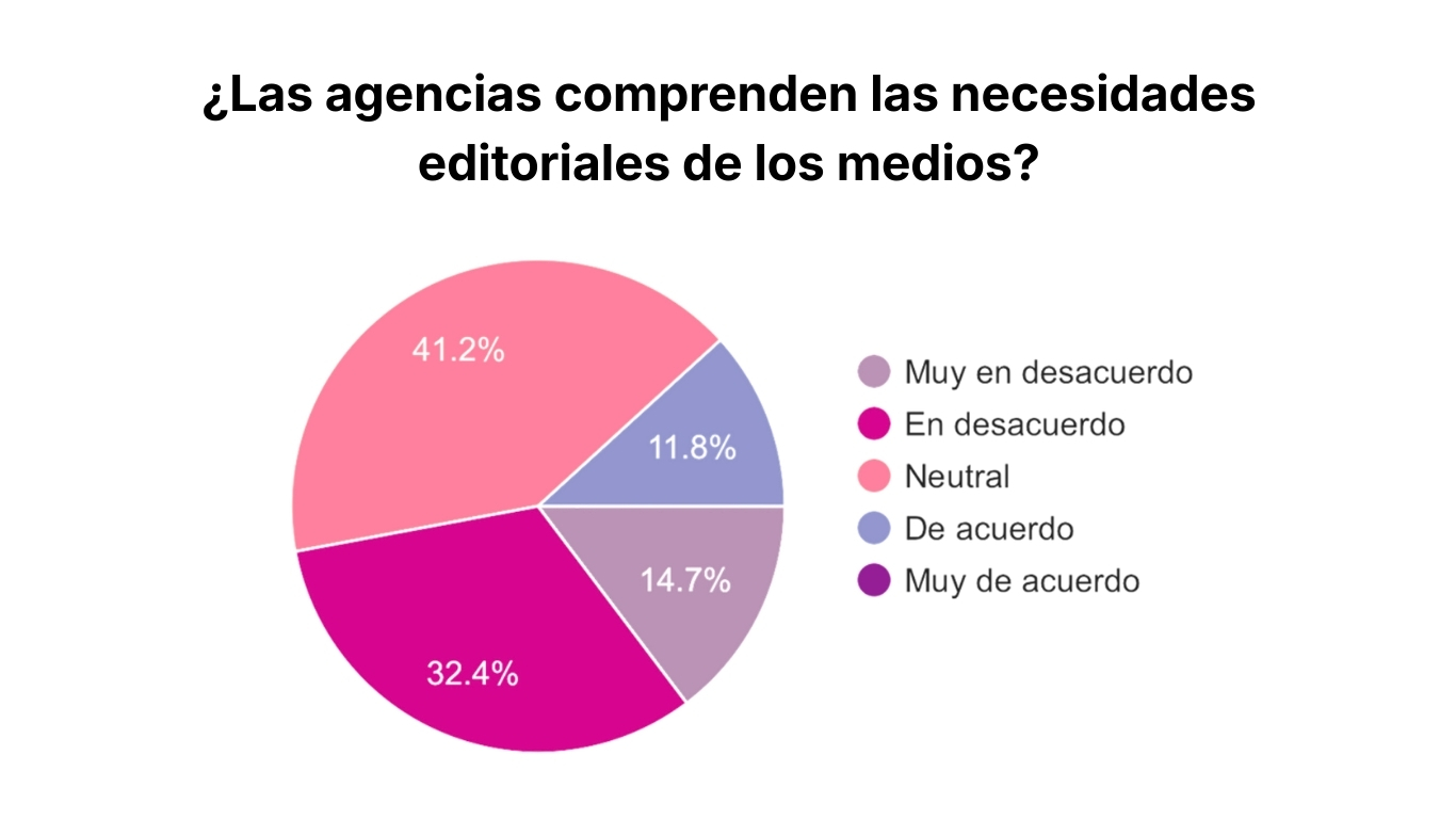 La encuesta lo confirma. Frente a la afirmación: “Las agencias comprenden las necesidades de los medios”, un 41% de los periodistas respondió de forma neutral, un 32% en desacuerdo, y un 14,7% muy en desacuerdo. En términos simples, más del 70% de los periodistas de medios percibe que desde las agencias no se comprenden de forma adecuada sus necesidades editoriales.