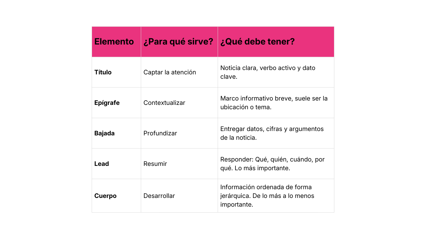 Un buen título es claro, preciso y simple. Evita la ambigüedad y el tono narrativo: en vez de atraer, suelen generar desinterés. Lo recomendable es escribir en presente, con verbo activo, e incluir lo más noticioso de la información: una cifra, un anuncio, un estudio o un hito relevante.